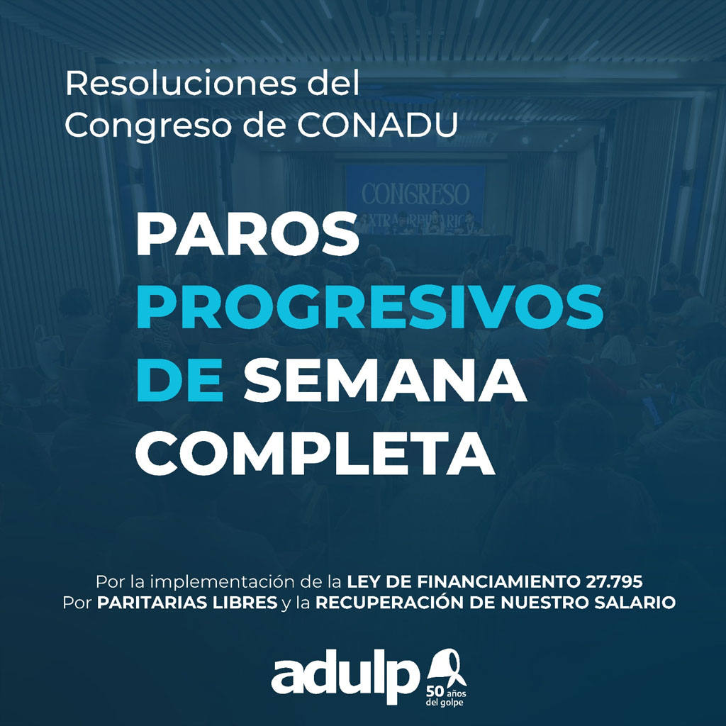 El Congreso Extraordinario de nuestra federación definió la profundización del plan de lucha por la aplicación de la Ley de Financiamiento Universitario, con la realización de paros progresivos de una semana completa durante todo el semestre. Así, se ratificó la medida de fuerza del 16 al 22 de marzo y se convoca al paro en las semanas que comienzan el lunes 30 de marzo y el lunes 27 de abril.