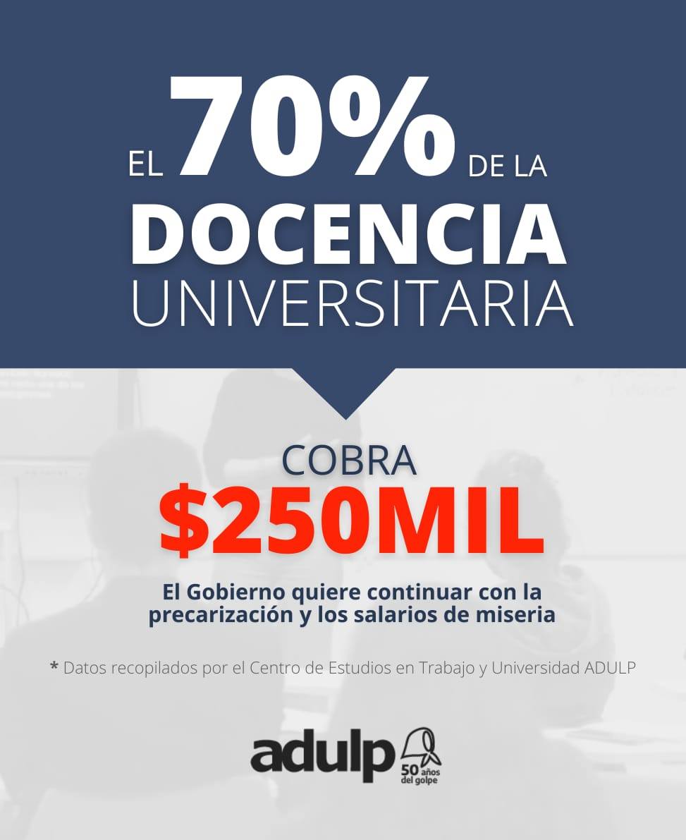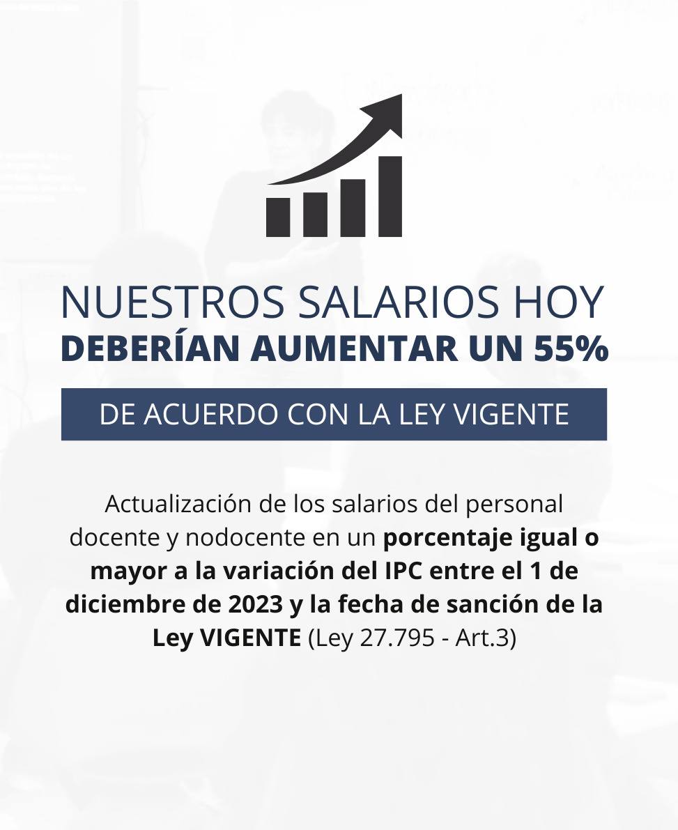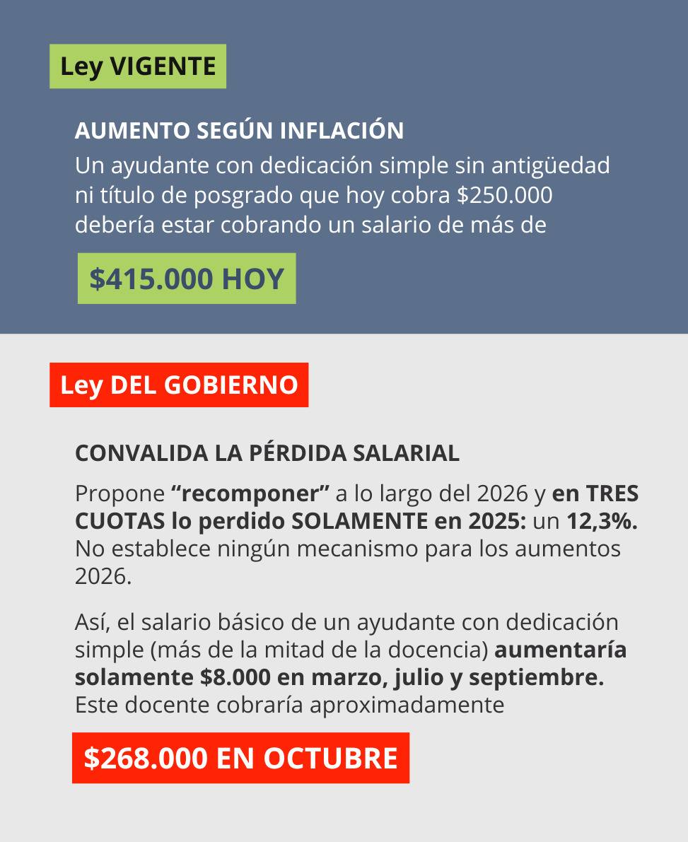 Un o una docente de nivel universitario con dedicación simple, sin antigüedad ni título de posgrado, hoy está cobrando alrededor de 250 mil pesos: un salario de miseria. De acuerdo a la Ley de Financiamiento 27.759 que la justicia ordenó aplicar, ese sueldo y el de toda la docencia debería aumentar hoy un 55%, y seguiría aumentando tras las reuniones paritarias. Ante este incumplimiento, y sin respuestas del Gobierno, los y las docentes estamos llevando adelante.