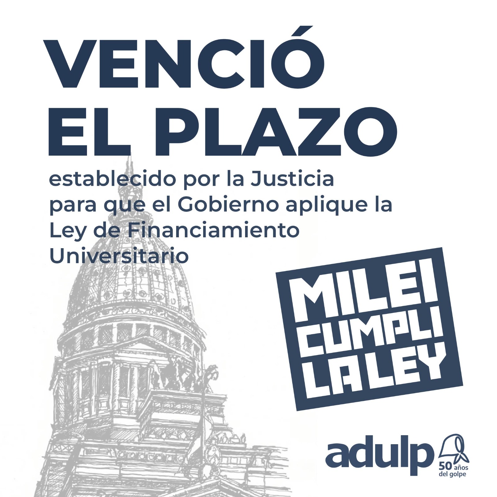 El plazo establecido por la Justicia para que el Gobierno implemente la Ley de Financiamiento Universitario VENCIÓ HOY. Milei debe recomponer los salarios de las y los trabajadores desde diciembre 2023 según el IPC y actualizar las becas, de acuerdo a lo resuelto por la Cámara Contencioso Administrativo Federal el 31 de marzo, cuando confirmó la cautelar. La Ley 27.795 es una conquista de las Universidades Nacionales, votada seis veces en el Congreso, y aún así el ejecutivo se niega a aplicarla hace 178 días. Nuestro reclamo es claro: MILEI CUMPLÍ LA LEY.